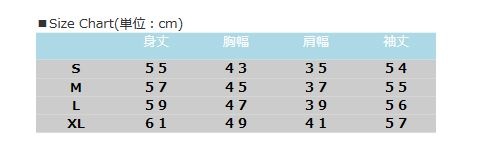 | サイズ | [Sサイズ]身丈55cm、胸幅43cm、肩幅35cm、 袖丈54cm (目安身長152〜158cm、胸囲78〜82cm) [Mサイズ]身丈57cm、胸幅45cm、肩幅37cm、 袖丈55cm (目安身長157〜163cm、胸囲81〜85cm) [Lサイズ]身丈59cm、胸幅47cm、肩幅39cm、 袖丈56cm (目安身長162〜168cm、胸囲84〜88cm) [XLサイズ]身丈61cm、胸幅49cm、肩幅41cm、 袖丈57cm (目安身長167〜173cm、胸囲87〜91cm) |